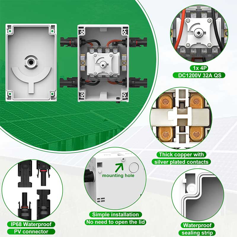 CNLonQcom Солнечный разъединитель постоянного тока, 1200 В, 32 А, 2 входа, 2 выхода, 2 строки, изолятор постоянного тока, 1200 В, 32 А, IP66, наружный, водонепроницаемый и пыленепроницаемый, для солнечных панелей и ветроэлектрических систем, автофургонов, домов, лодок.